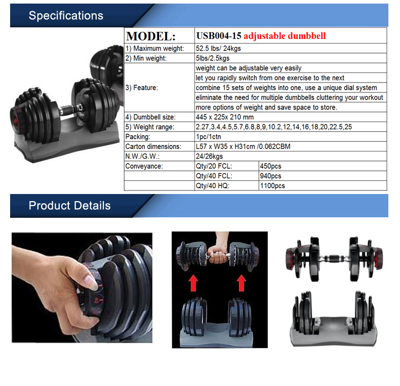 Adjustable Dumbbell Model No.: USB004-15 Products Category : Dumbbell INQUIRY Details Send Inquiry Name:* E-mail:* Tel: Content:* Verification Code:* (All * must be filled in)